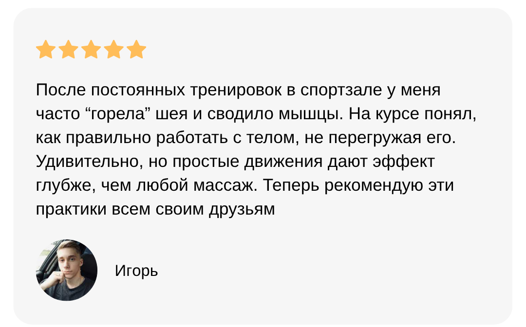 Почувствуешь лёгкость движений в шее и плечах, вместо зажатости.