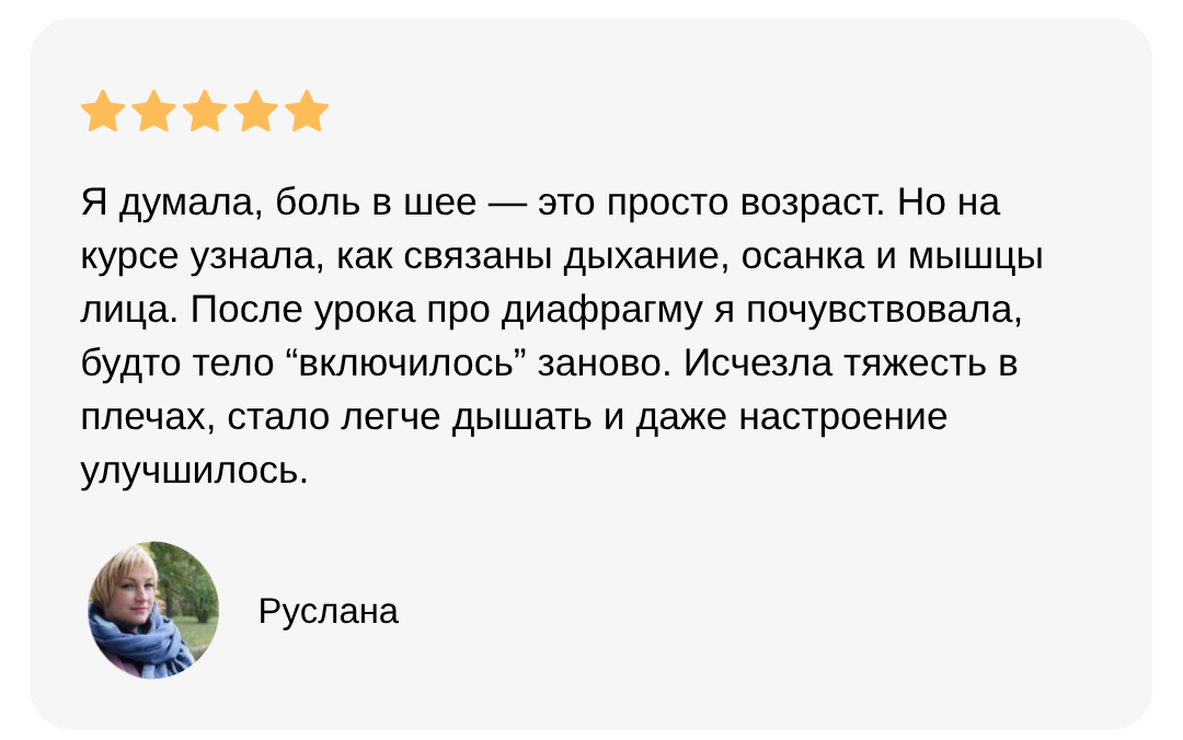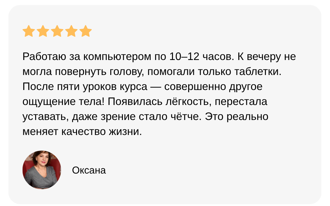 Никаких резких движений или сложных поз. Ты работаешь с телом осознанно, шаг за шагом, через комфорт и расслабление. Уже с первых занятий почувствуешь, как уходит боль и возвращается лёгкость.